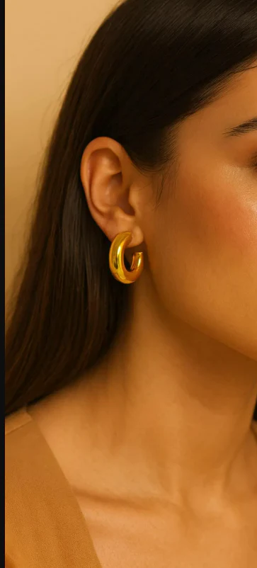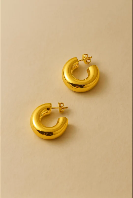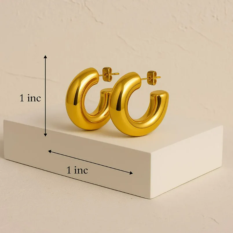 These chunky gold hoops are made from non-tarnish stainless steel, so they keep their shine and don’t fade. They’re hypoallergenic, water-safe, and perfect for everyday wear. The thick, rounded shape gives a bold, stylish look with a comfortable feel. Secure push-back posts included.