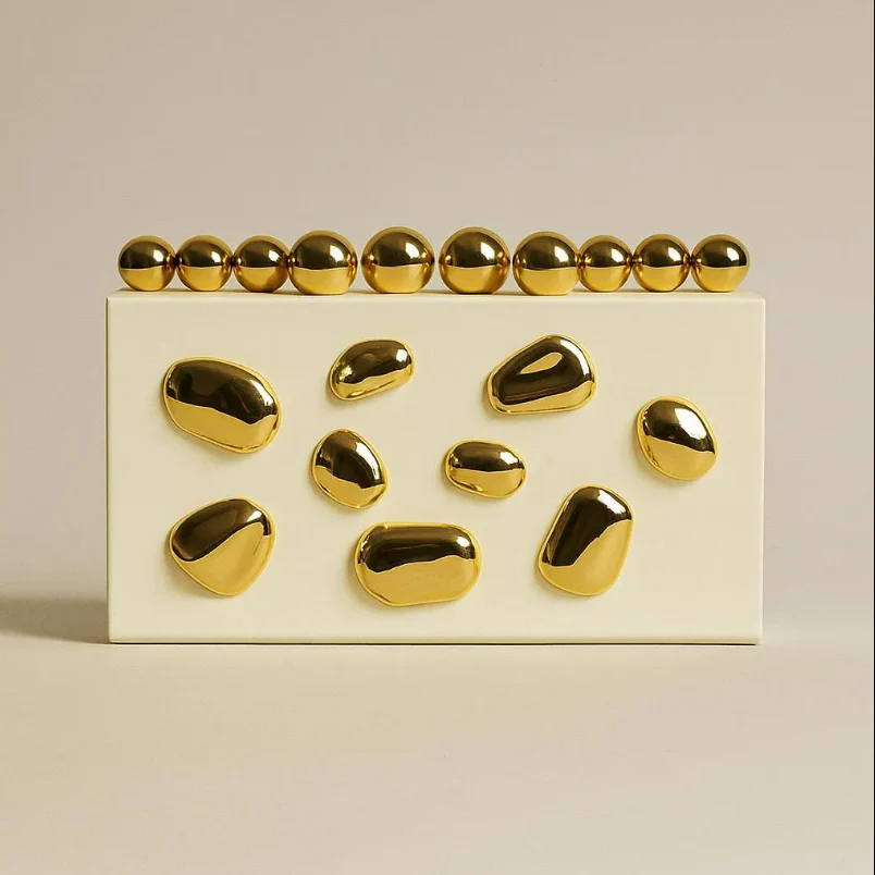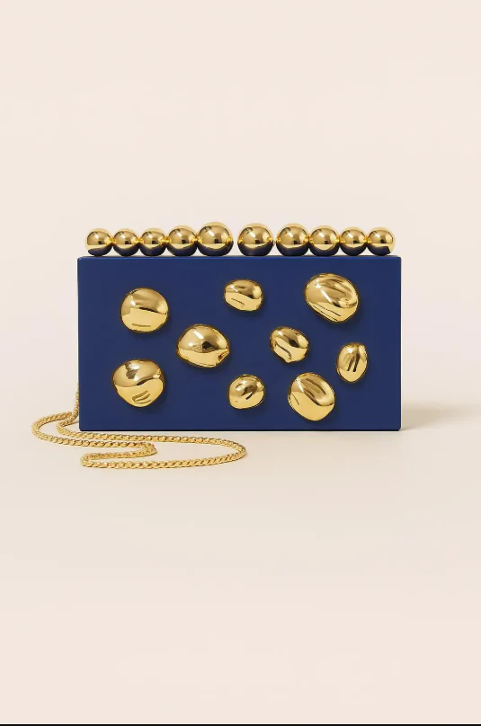 This clutch is made for women who love a bold, stylish statement without overdoing it. The design combines a clean, boxy shape with eye-catching gold accents that look like melted metal — giving it a unique, modern touch. The smooth, high-shine surface and rounded gold details make it look luxurious while still easy to pair with anything from a sleek dinner outfit to a night-out look.