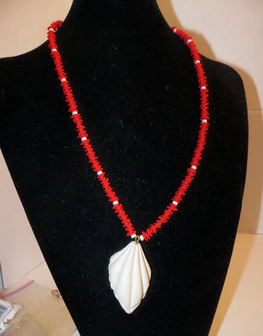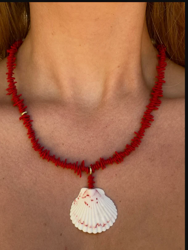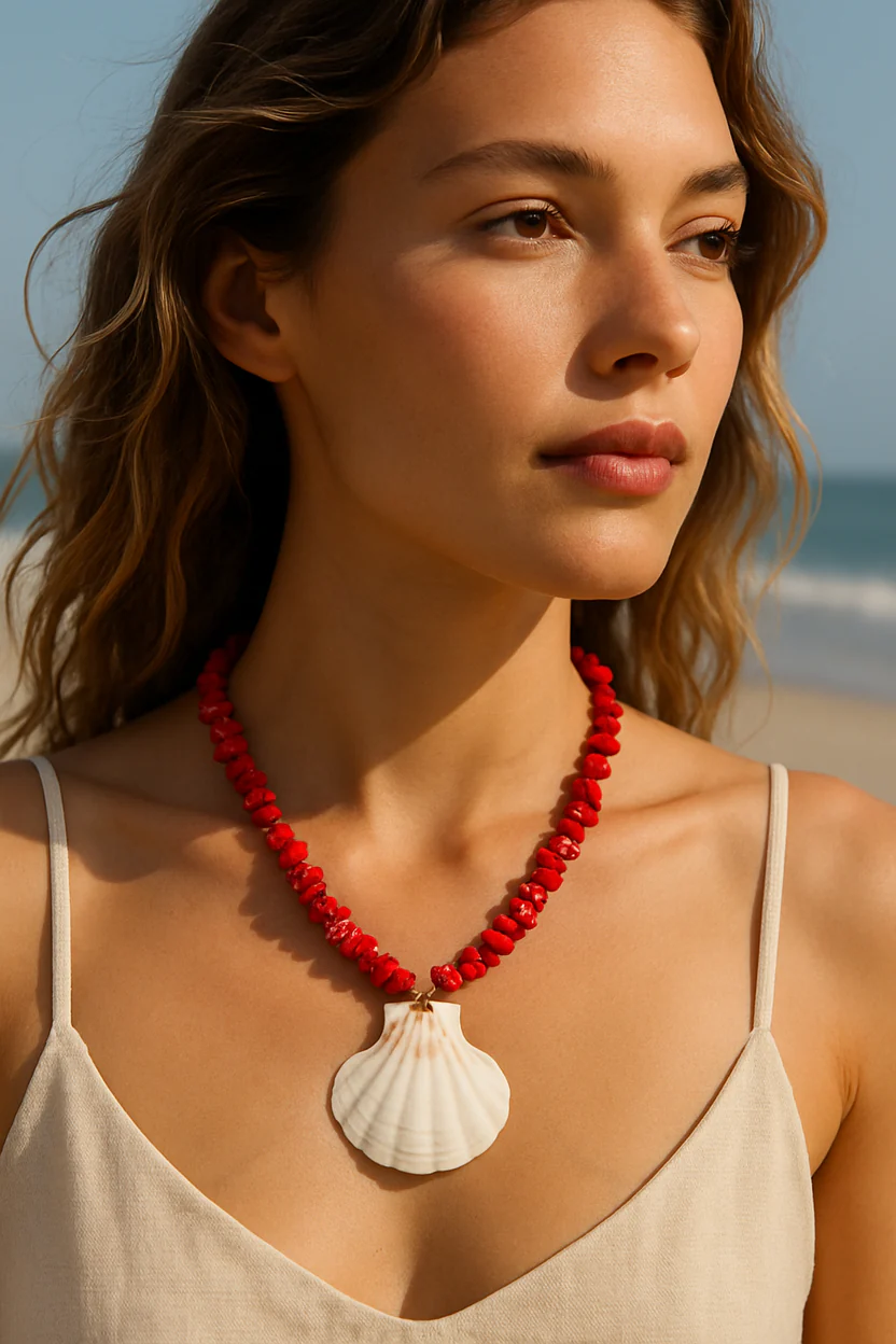 Make a splash in this fun red coral necklace with white pearls and a white scallop shell pendant. Made with red coral beads, freshwater pearls, and a seashell pendant.