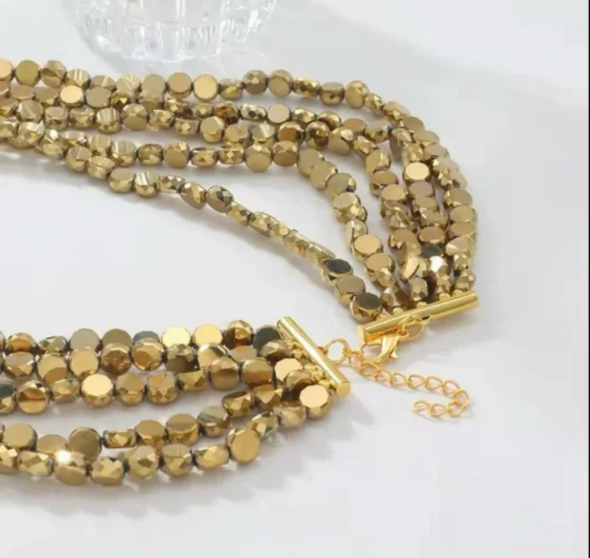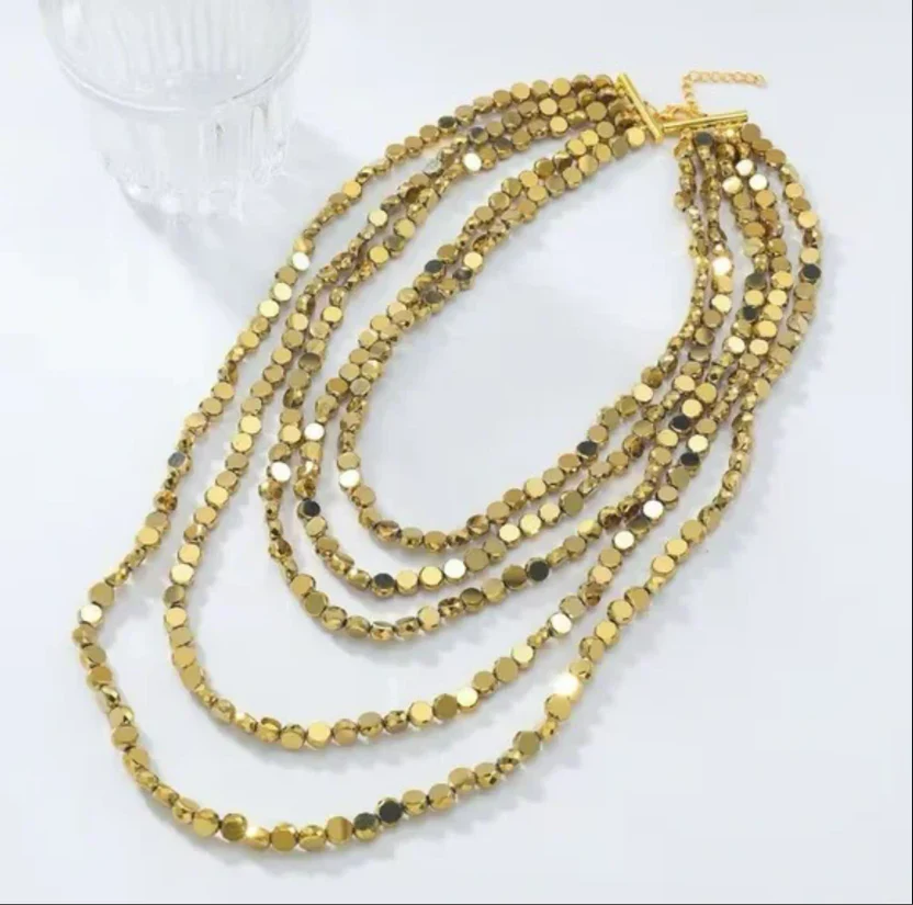 This stunning, multi-layered gold necklace adds a touch of elegance to any outfit. Perfect for any occasion.