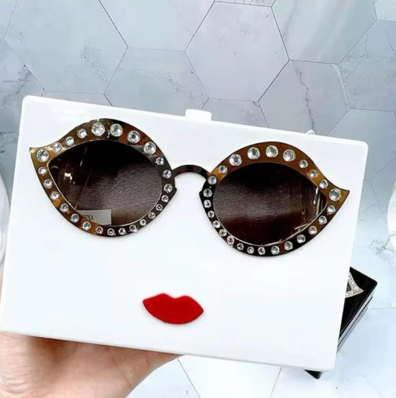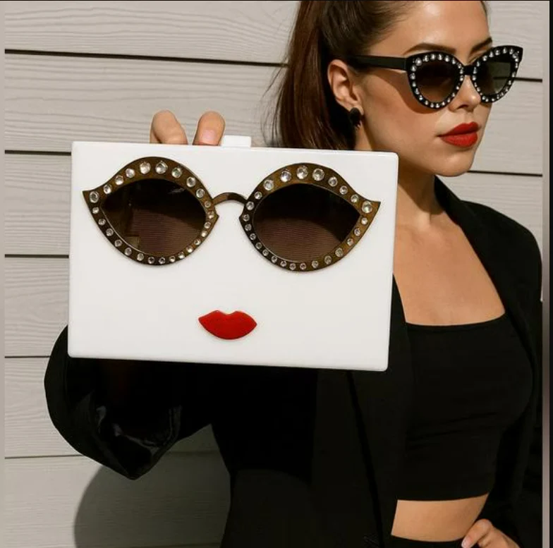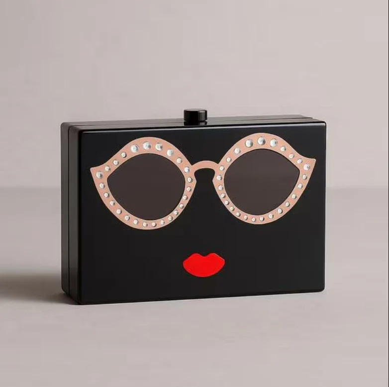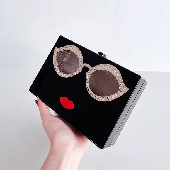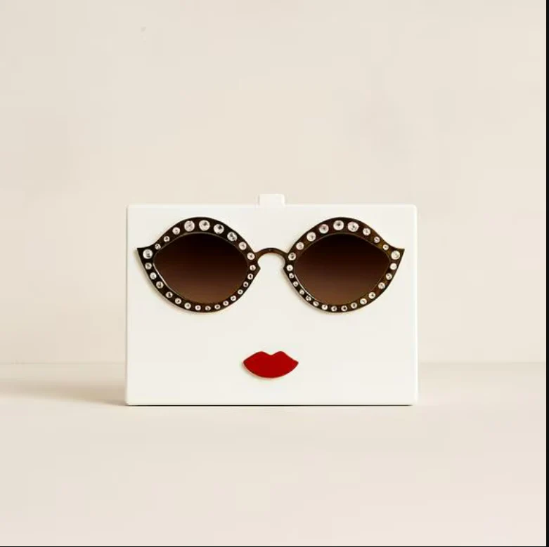 Cute and stylish face-shaped clutch made from smooth acrylic. It has fun sunglasses and red lips on the front, plus a gold chain you can wear on your shoulder or tuck inside. It opens at the top with a clasp and is strong enough to hold your essentials.
