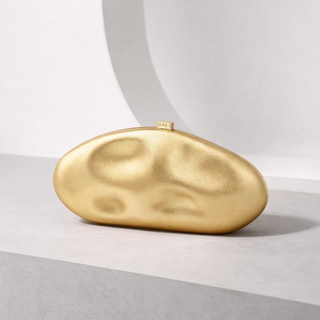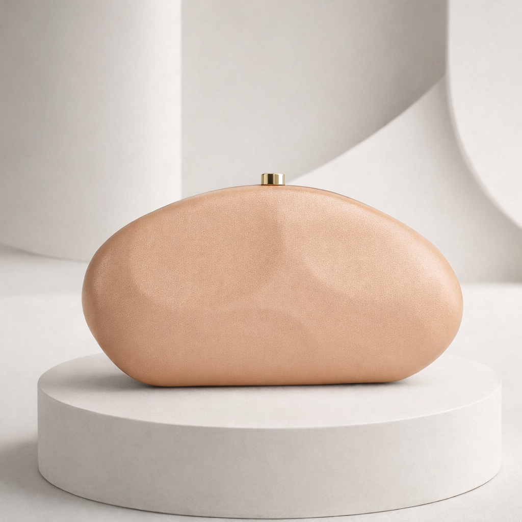 A hard shell oval purse with a gold clasp. It’s firm, lightweight, and easy to hold in your hand. Fits basics like your phone, cards, keys, and lip gloss. Perfect for dinners, parties, or dressy outings