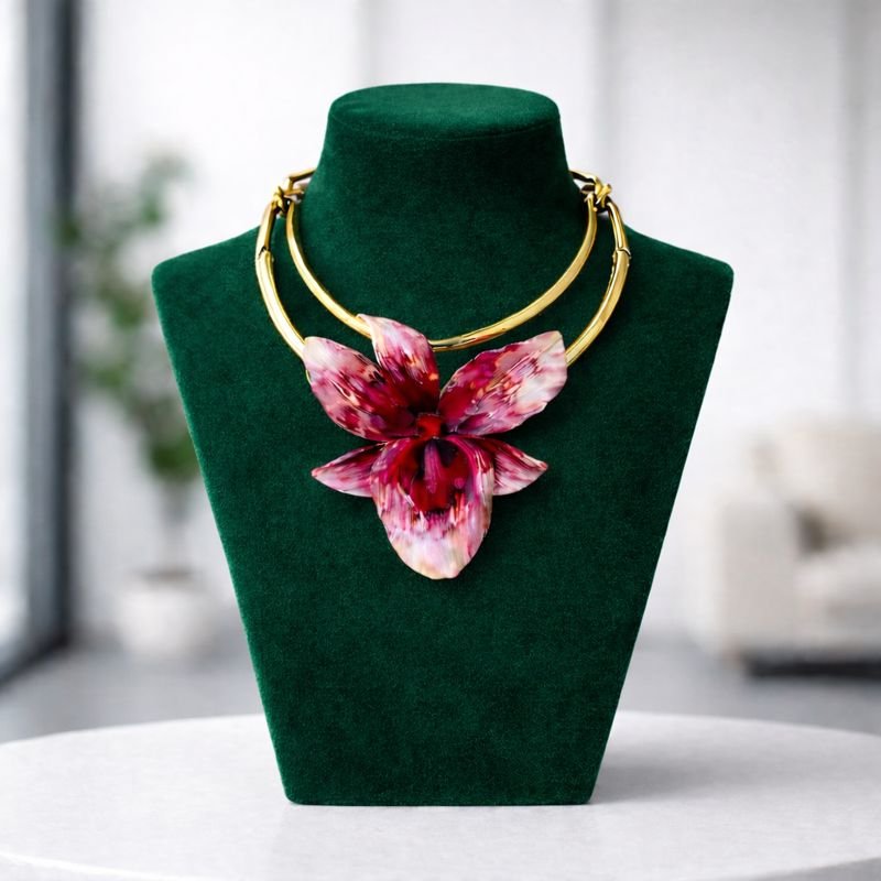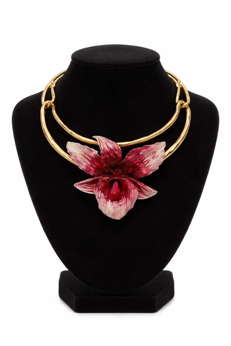 A luxurious gold collar necklace finished with a sculpted orchid centerpiece. Designed to stand out, elevate any look, and turn heads without trying too hard. Elegant, confident, and undeniably statement-making.