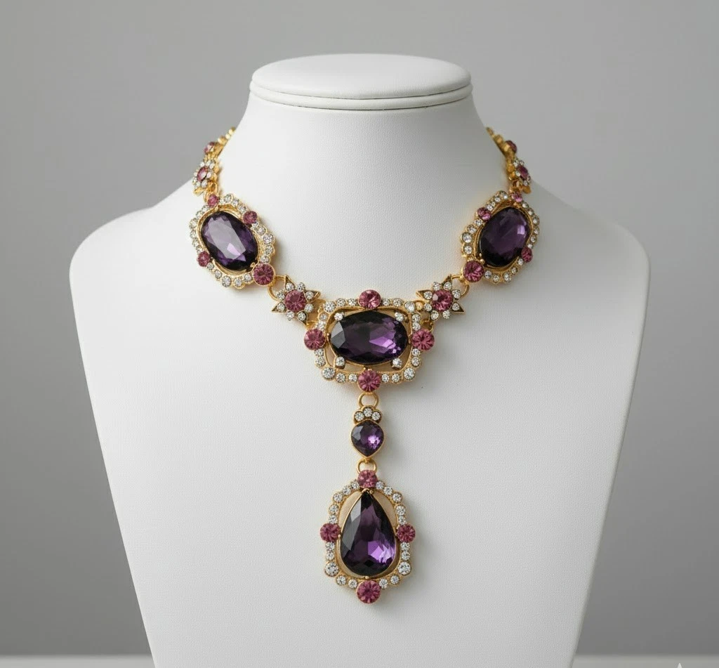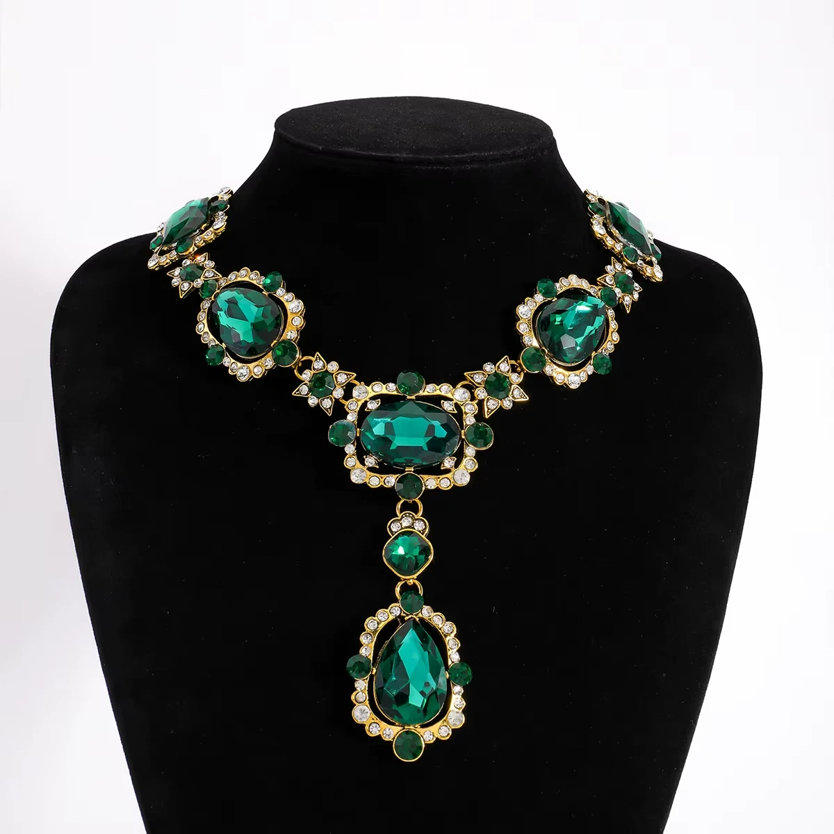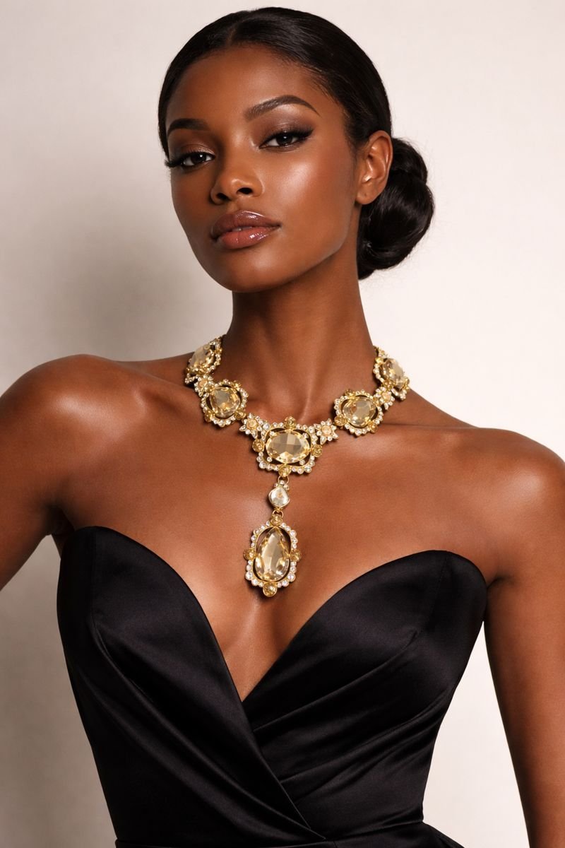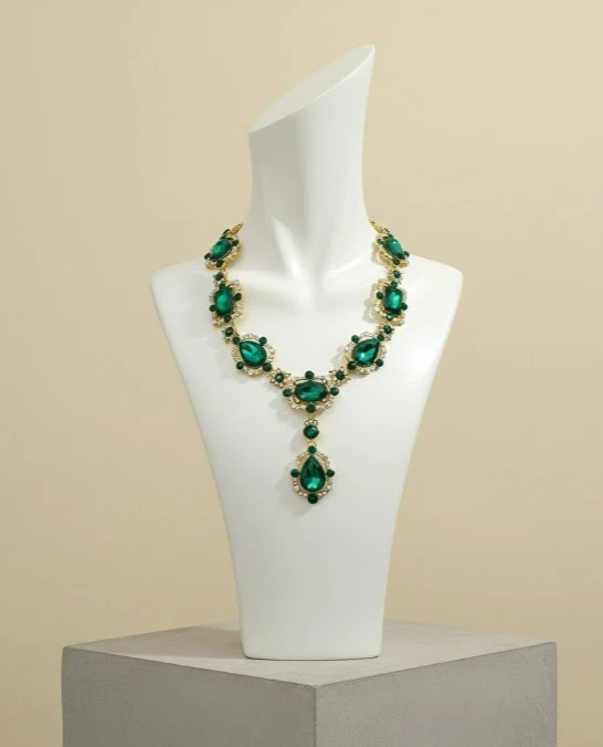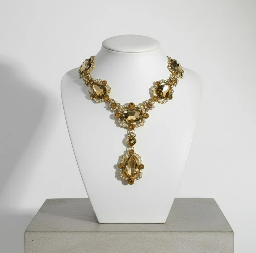 Statement necklace with large glass stones and clear crystal accents. Gold-tone finish with a secure lobster clasp and extender chain. Sits nicely on the neckline with a centered drop pendant. Great for parties, weddings, or dressy outfits.