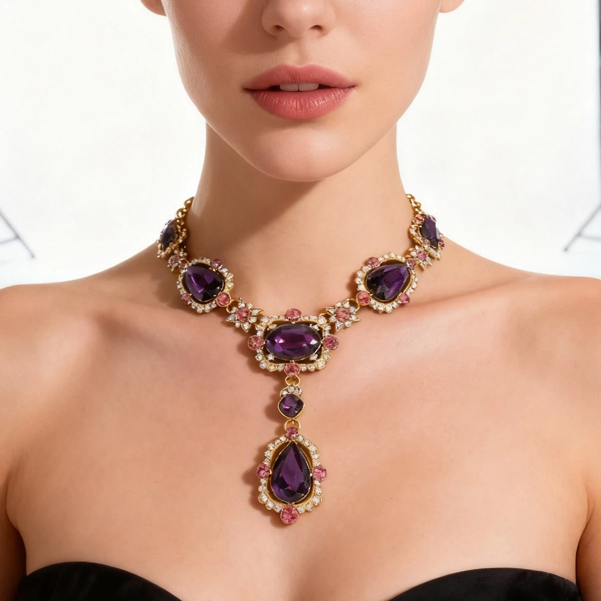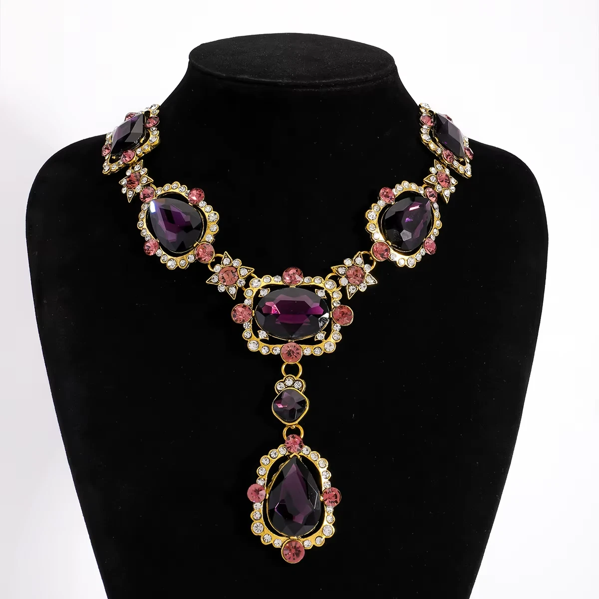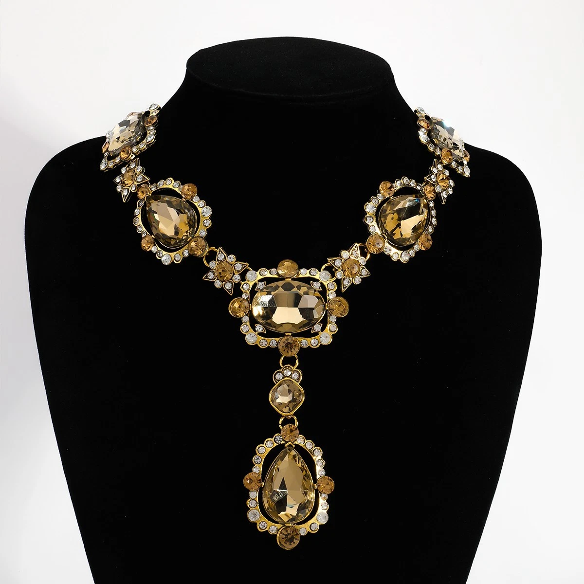 Statement necklace with large glass stones and clear crystal accents. Gold-tone finish with a secure lobster clasp and extender chain. Sits nicely on the neckline with a centered drop pendant. Great for parties, weddings, or dressy outfits.
